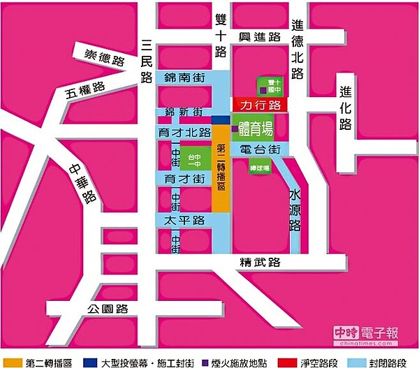 台中主場2階段封閉路段及時間如下:第1階段:雙十路段現場轉播區,31日下午1點至元旦凌晨3點。